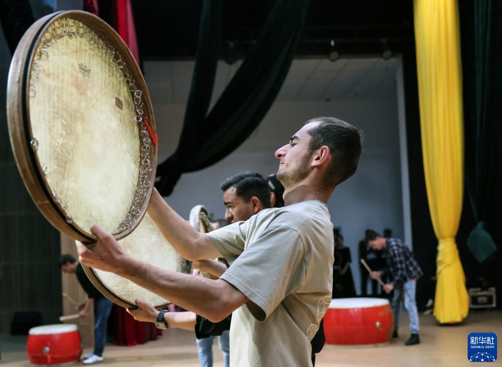 新疆塔縣文工團樂(lè )手居馬巴依·先比(右)在排練時(shí)演奏中號手鼓(9月4日攝)。新華社記者 蘭紅光 攝