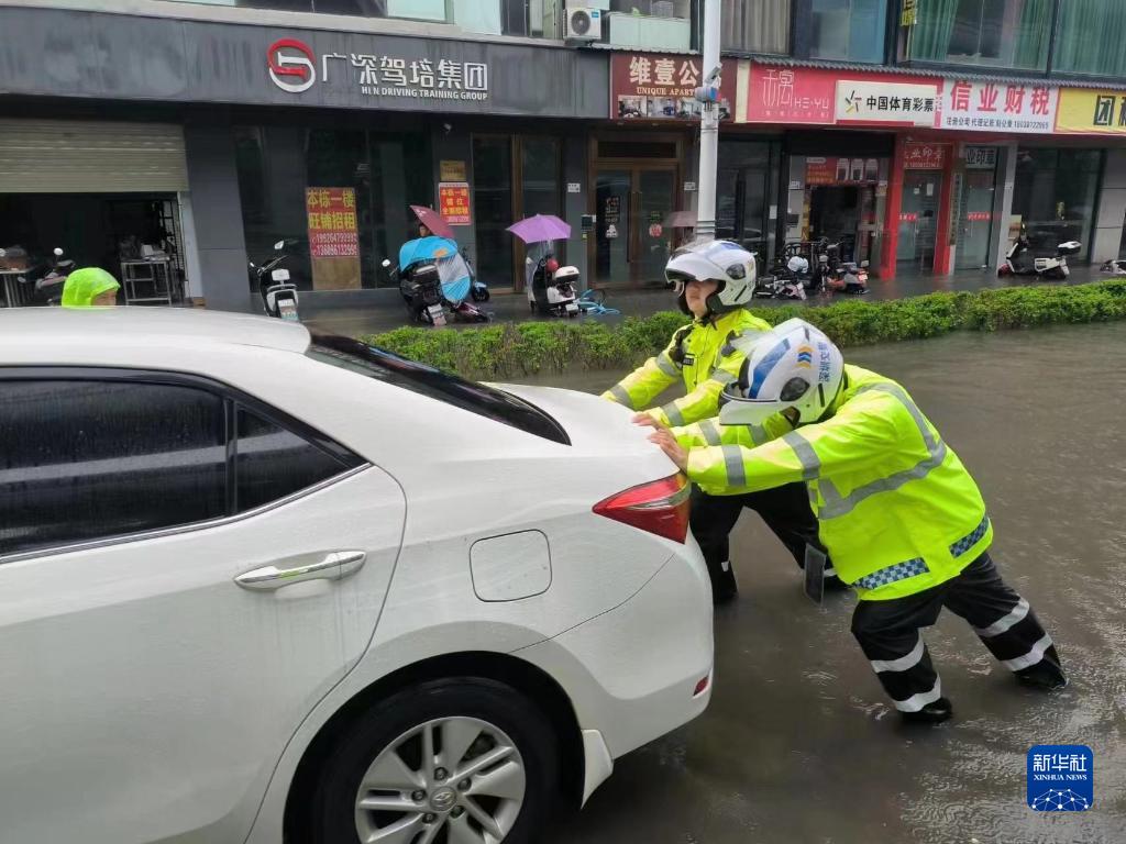 9月8日,深圳交警鐵騎隊員在深圳市光明區積水路段協(xié)助將被困車(chē)輛推移至安全地帶。