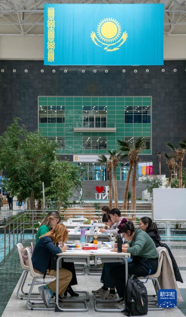 9月6日,學(xué)生在哈薩克斯坦首都阿斯塔納的納扎爾巴耶夫大學(xué)校園中學(xué)習。