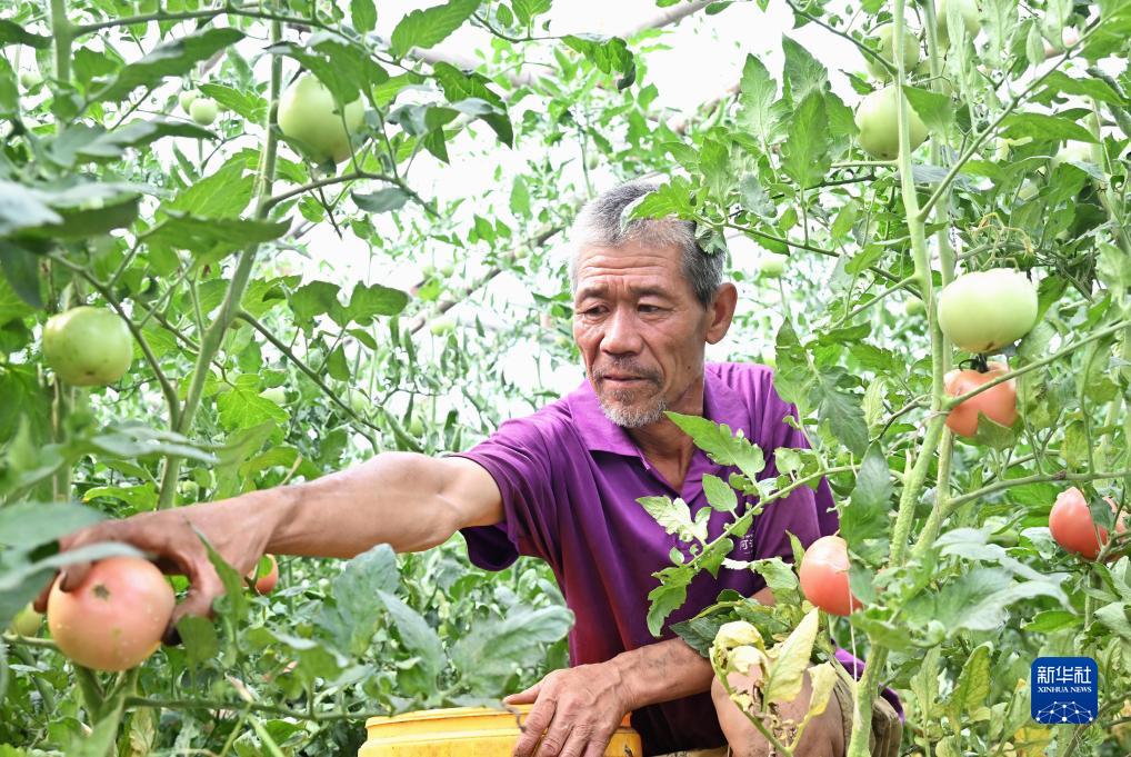 9月8日,河北省灤州市小馬莊鎮一位農民在大棚內采摘西紅柿。