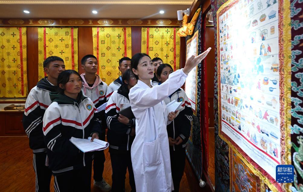 9月8日,在果洛藏族自治州職業(yè)技術(shù)學(xué)校,藏醫醫療與藏藥專(zhuān)業(yè)學(xué)生跟隨授課老師觀(guān)看藏醫典籍唐卡。
