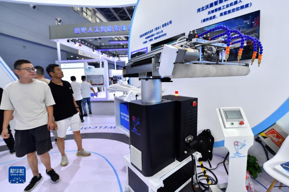 9月7日,參觀(guān)者在數博會(huì )上觀(guān)看五軸智能工業(yè)機器人。