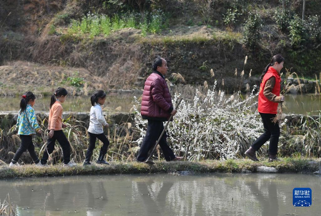 潘先鋒(右二)帶著(zhù)孩子們去植樹(shù)(2023年2月27日攝)。