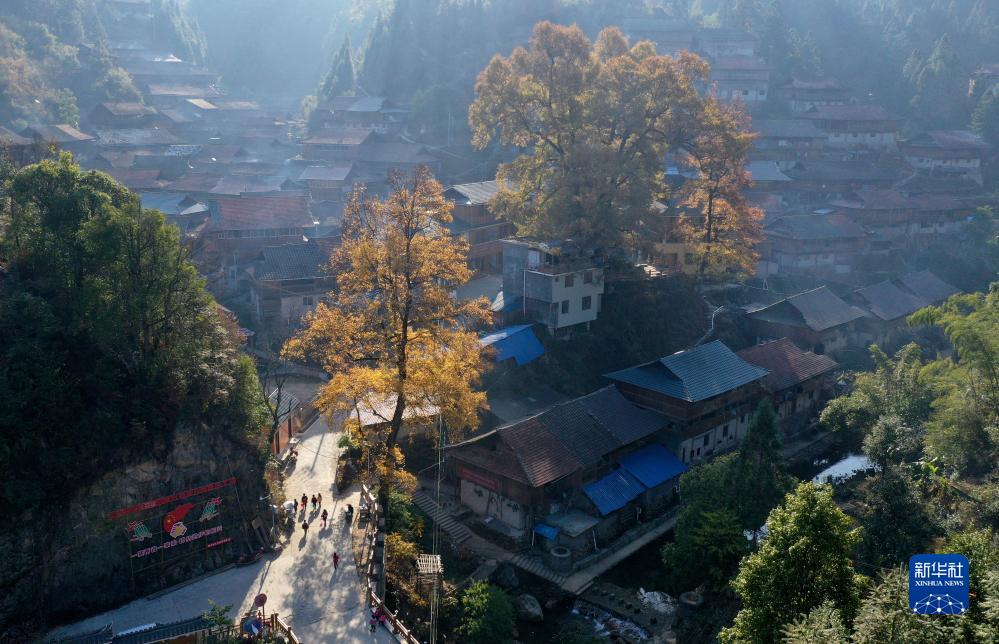 烏英苗寨教學(xué)點(diǎn)的孩子們在潘先鋒的帶領(lǐng)下巡寨搞衛生(無(wú)人機照片,2022年12月21日攝)。
