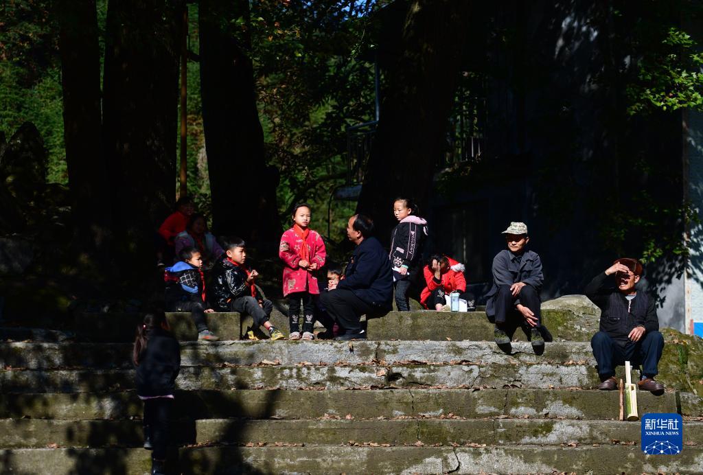 在烏英苗寨教學(xué)點(diǎn),潘先鋒(右五)在古樹(shù)下與孩子們交流(2021年11月25日攝)。