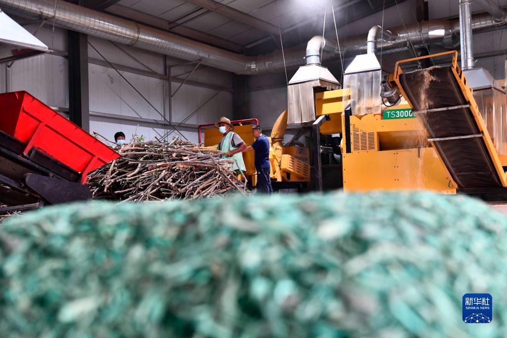 9月7日,在德州市碳循環(huán)創(chuàng )新示范基地,工作人員對園林綠化垃圾進(jìn)行粉碎加工作業(yè)。