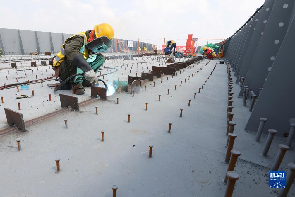 9月8日,在位于江蘇省東臺市的東興高速上跨G15沈海高速架梁作業(yè)現場(chǎng),工人在進(jìn)行焊接作業(yè)。