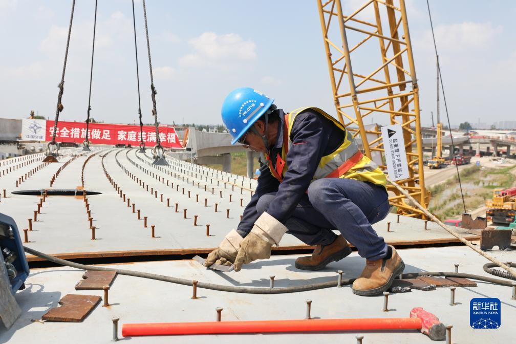 9月8日,在位于江蘇省東臺市的東興高速上跨G15沈海高速架梁作業(yè)現場(chǎng),工人在進(jìn)行定位作業(yè)。