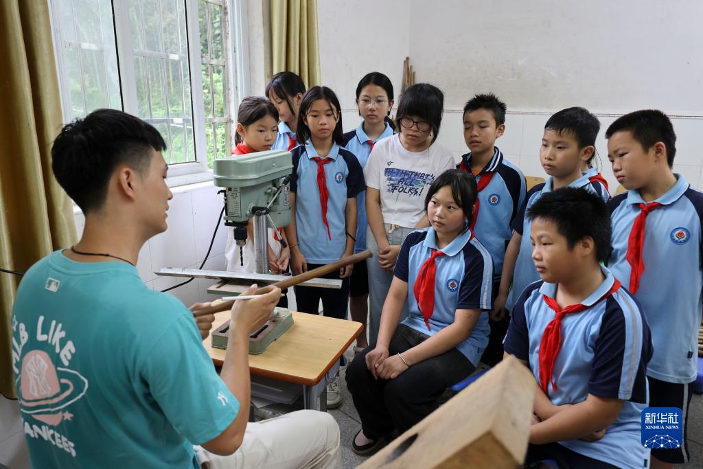 在江西省吉安市泰和縣水槎鄉中心小學(xué),肖惠文教孩子們制作竹笛(9月5日攝)。