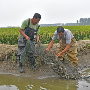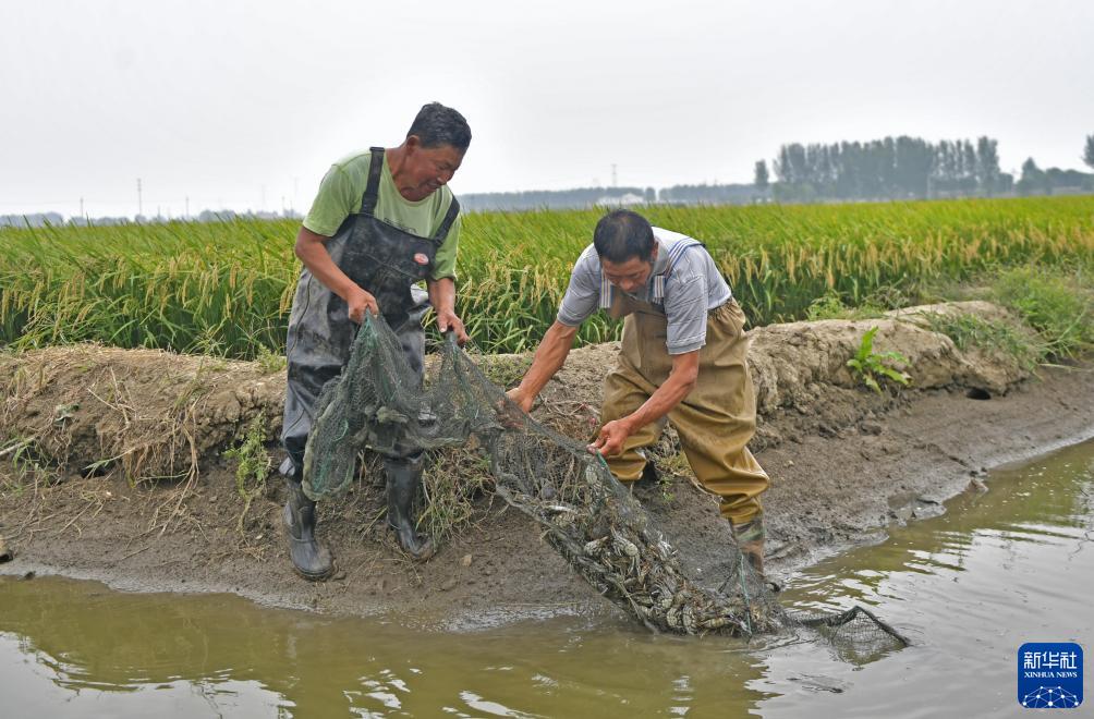 9月8日,農民在沈陽(yáng)市沈北新區興隆臺街道青年農場(chǎng)稻田里收獲河蟹。