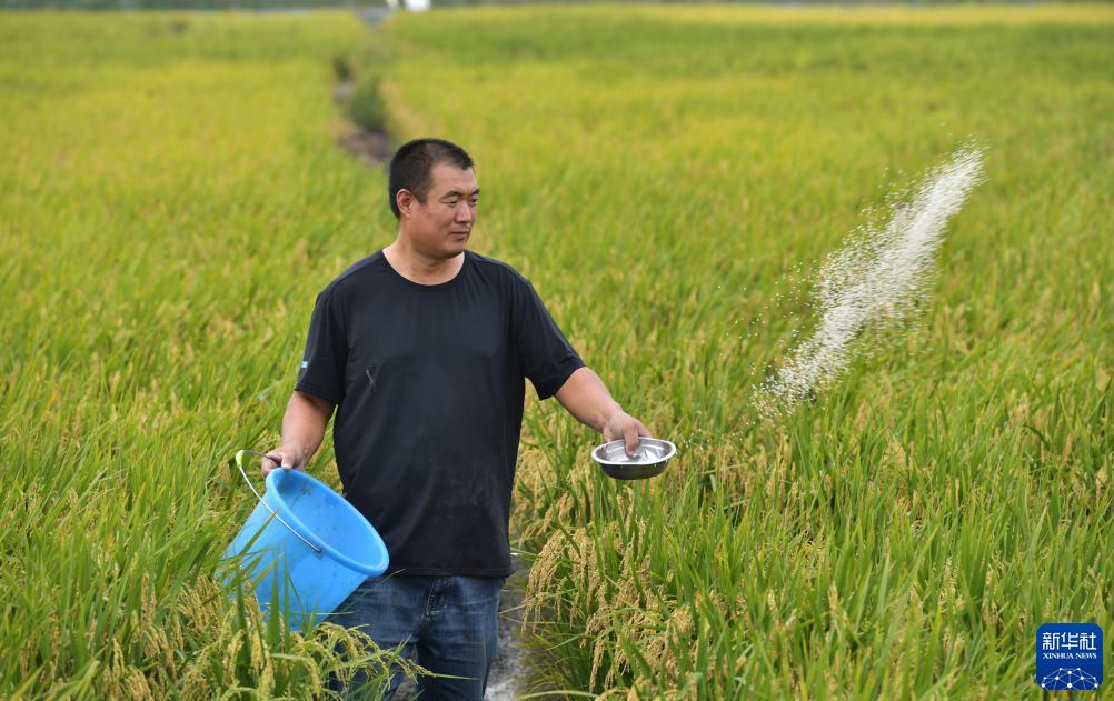9月8日,農民在沈陽(yáng)市沈北新區興隆臺街道青年農場(chǎng)稻田里投喂河蟹。