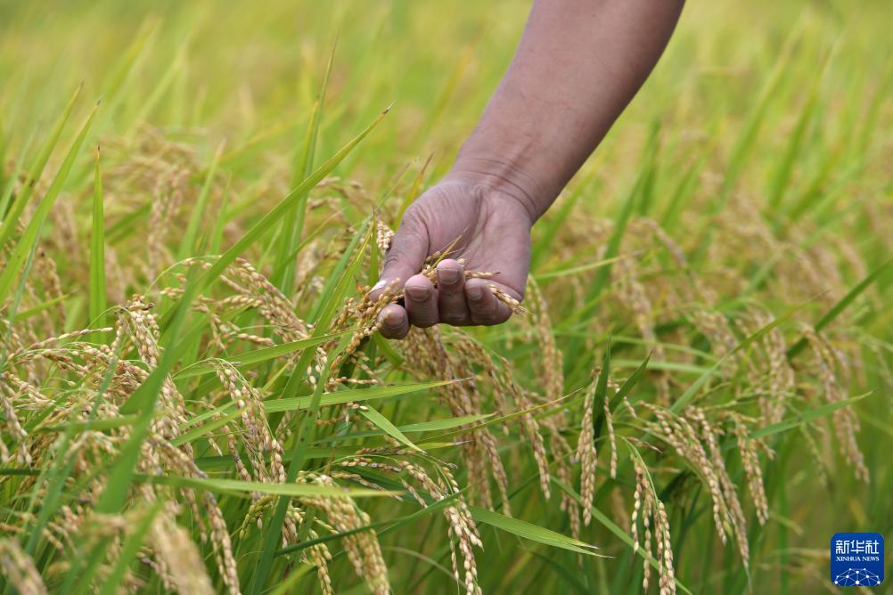 9月8日,農民在沈陽(yáng)市沈北新區興隆臺街道青年農場(chǎng)稻田里查看水稻成熟情況。