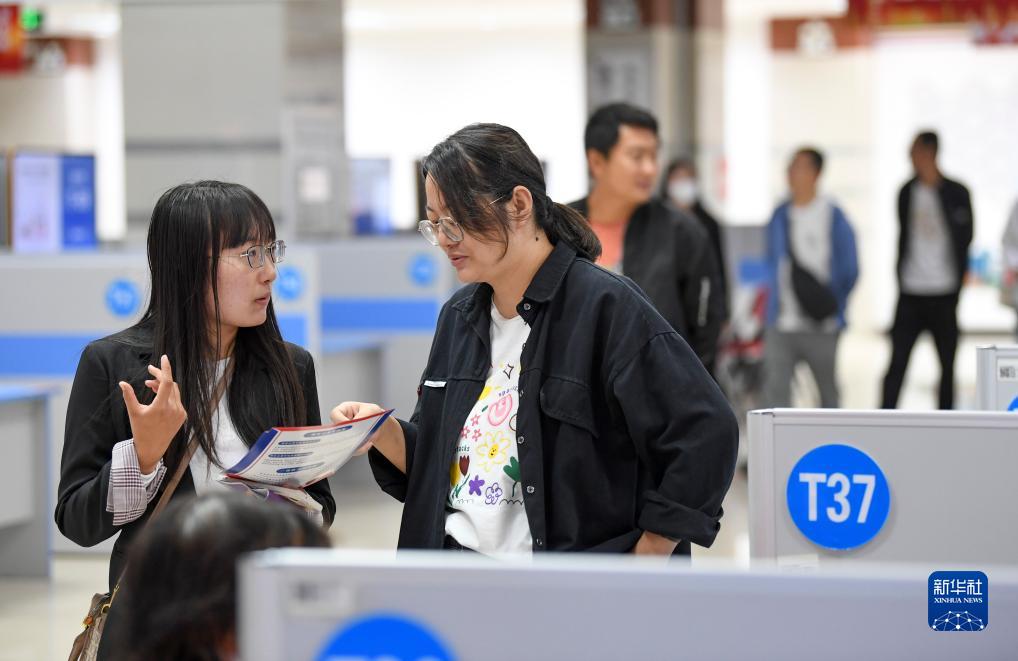 9月9日,求職者(左)在招聘會(huì )現場(chǎng)與用人單位工作人員交流。