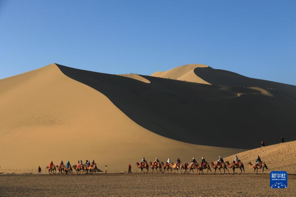 9月9日,游客在甘肅省敦煌市鳴沙山月牙泉景區游覽。