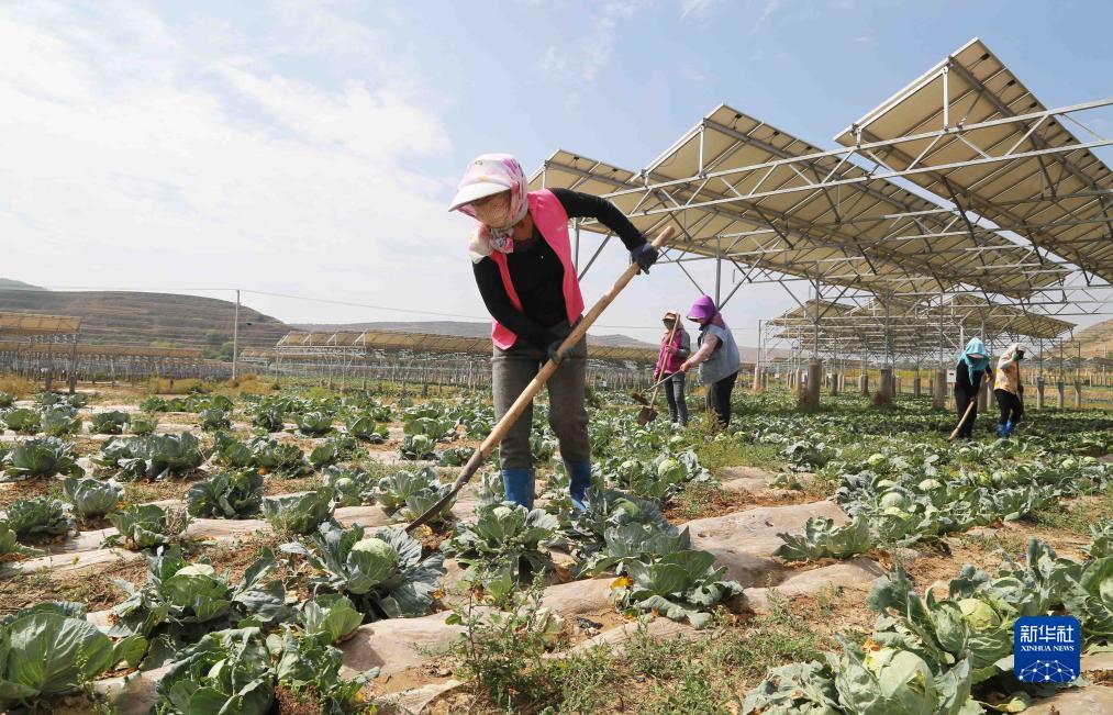9月9日,農民在通渭縣榜羅鎮四新村光伏農業(yè)產(chǎn)業(yè)示范園的蔬菜地里勞作。