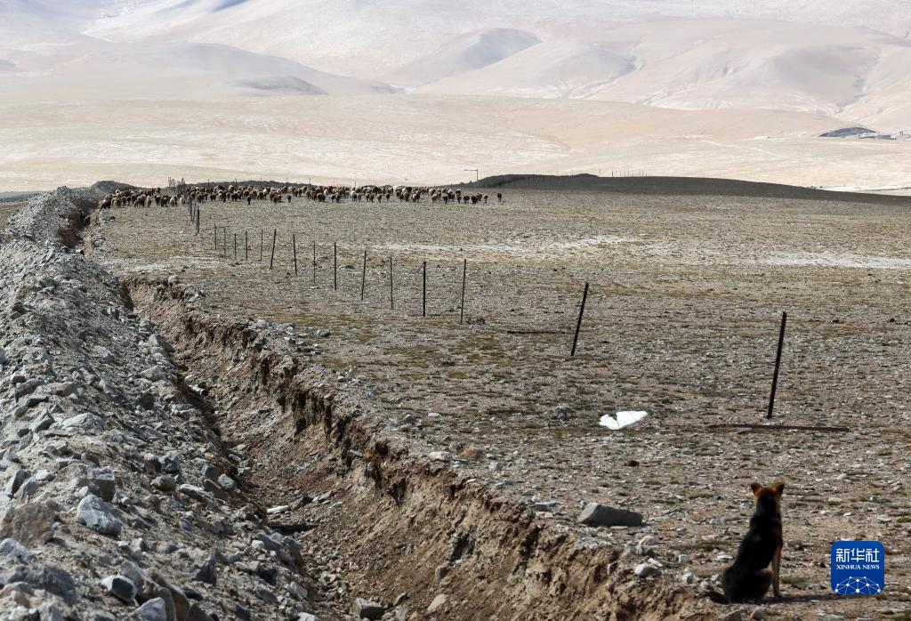 一只牧羊犬遠遠地看著(zhù)羊群吃草(9月6日攝)。