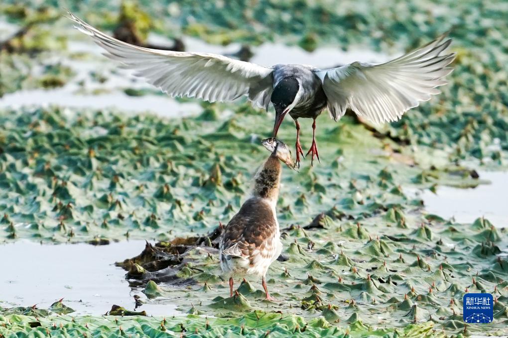 在江蘇省鹽城市建湖縣九龍口國家濕地公園內,須浮鷗銜著(zhù)小魚(yú)給幼鳥(niǎo)喂食(9月7日攝)。