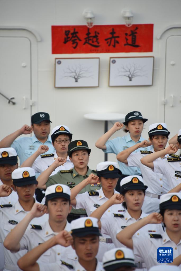 中國海軍“和平方舟”號醫院船跨越赤道時(shí),文職人員和軍人一起參加宣誓儀式(7月22日攝)。