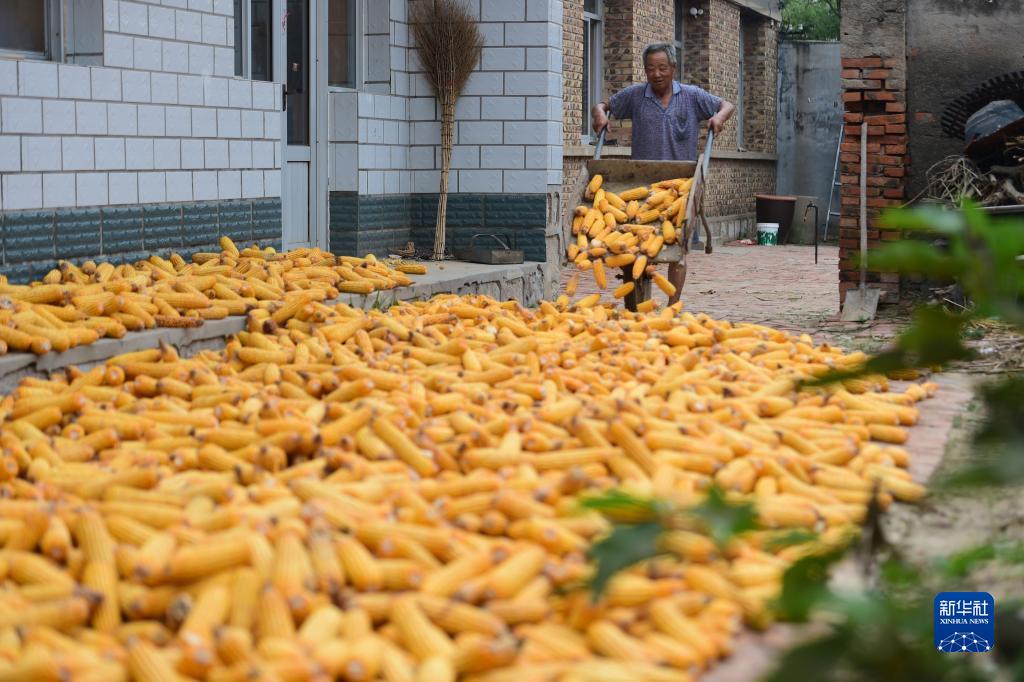 9月9日,鹽山縣小營(yíng)鄉前陳村農民在晾曬收獲的玉米。