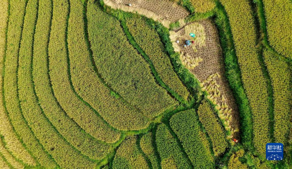 9月9日,村民在貴州省銅仁市玉屏侗族自治縣亞魚(yú)鄉郭家灣村搶收稻谷(無(wú)人機照片)。
