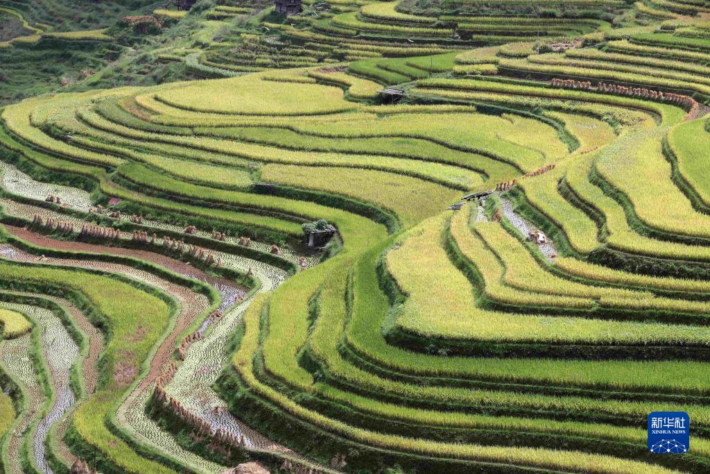 9月9日,農民在貴州省黔東南苗族侗族自治州從江縣加鳩鎮擺少村收割稻谷。