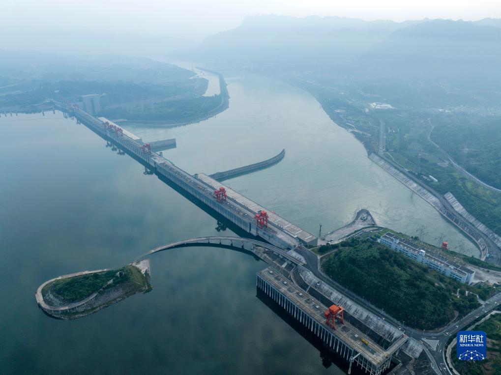 9月10日在湖北省宜昌市拍攝的蓄水運行中的三峽水利樞紐工程(無(wú)人機照片)。