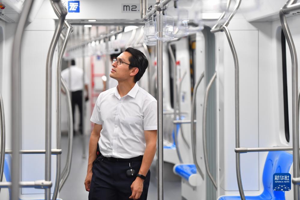 墨西哥來(lái)賓在中國中車(chē)出口墨西哥城輕軌列車(chē)首列車(chē)內參觀(guān)(9月9日攝)。