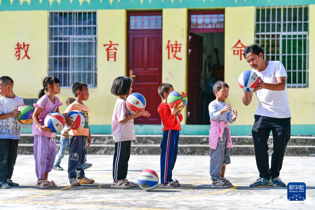 陸成文組織學(xué)生在體育課上練習投籃(9月6日攝)。