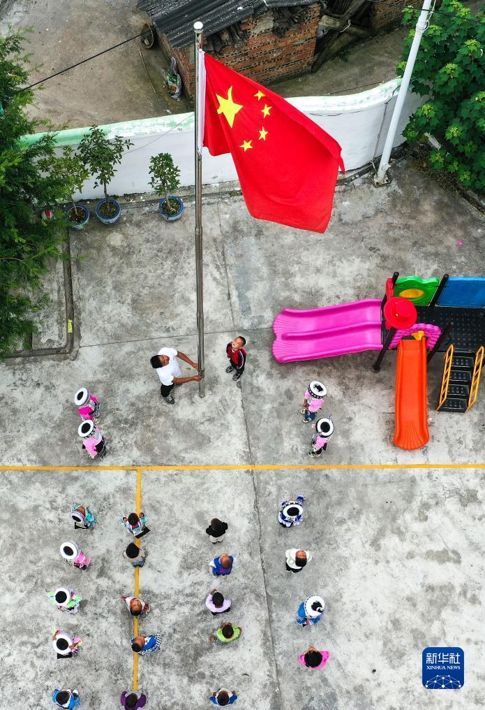 陸成文與學(xué)生在教學(xué)點(diǎn)升旗(9月7日攝,無(wú)人機照片)。