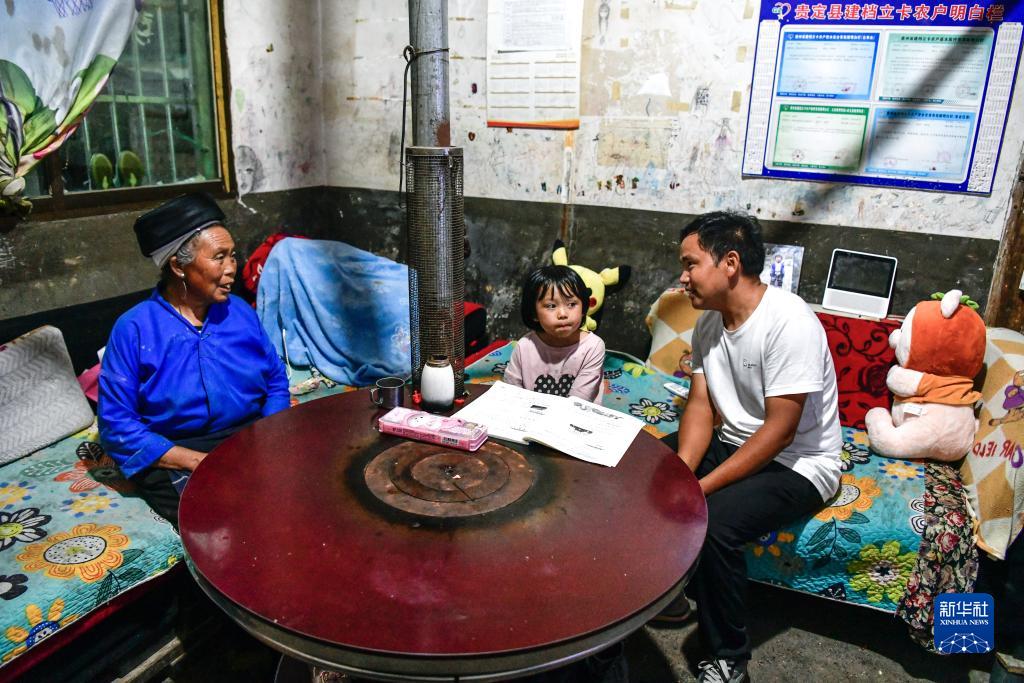 陸成文(右)在學(xué)生家中家訪(fǎng)(9月6日攝)。
