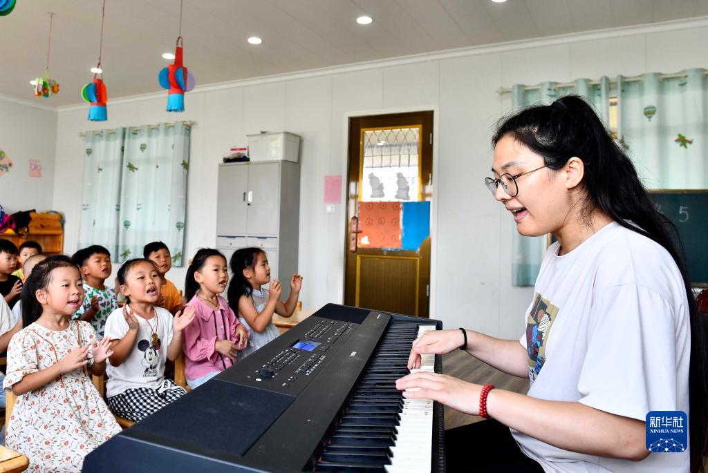 9月5日,在微山縣高樓鄉渭河小學(xué),音樂(lè )老師劉夢(mèng)然在教學(xué)前班的孩子們唱兒歌。