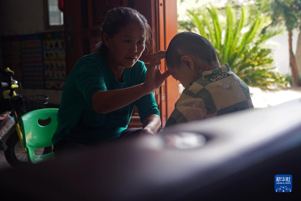 奶奶在家中查看小澤的傷口(9月4日攝)。