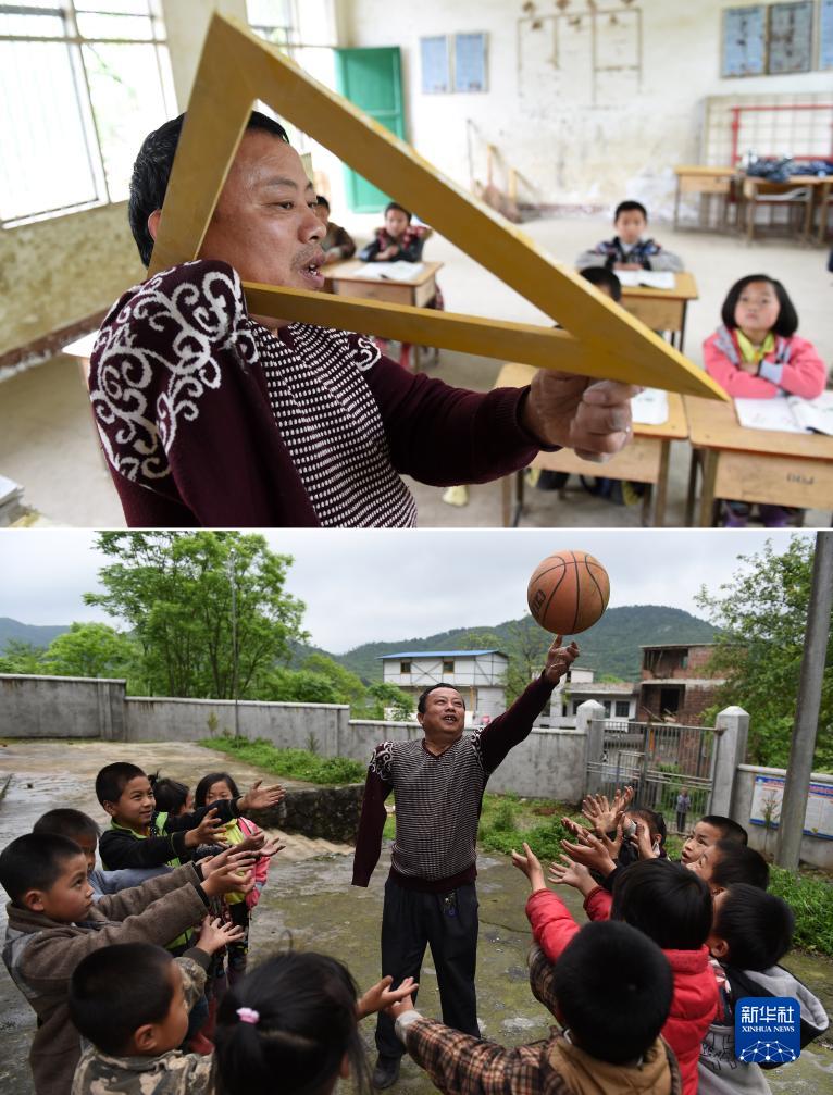 拼版照片:廣西全州縣白寶鄉北山村小學(xué)的唐廣芳老師給學(xué)生上數學(xué)課(上圖),唐廣芳老師給學(xué)生上體育課(下圖)(2016年4月26日攝)。1995年,唐廣芳老師在一次意外觸電中失去右臂。此后,他艱難學(xué)會(huì )用左手寫(xiě)字,繼續堅守山村教學(xué)崗位。