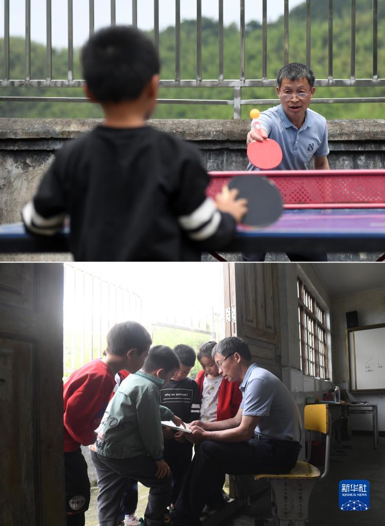拼版照片:廣西靈川縣蘭田瑤族鄉深潭教學(xué)點(diǎn)的趙洪老師和學(xué)生打乒乓球(上圖),趙洪老師課后輔導學(xué)生功課(下圖)(2023年5月18日攝)。 趙洪老師41年的教學(xué)生涯中,先后在蘭田瑤族鄉的9所學(xué)校教過(guò)書(shū),他登上了2022年第四季度“中國好人榜”。