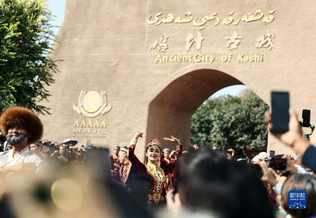 游客在新疆喀什古城景區東門(mén)觀(guān)看開(kāi)城儀式表演(9月7日攝)。