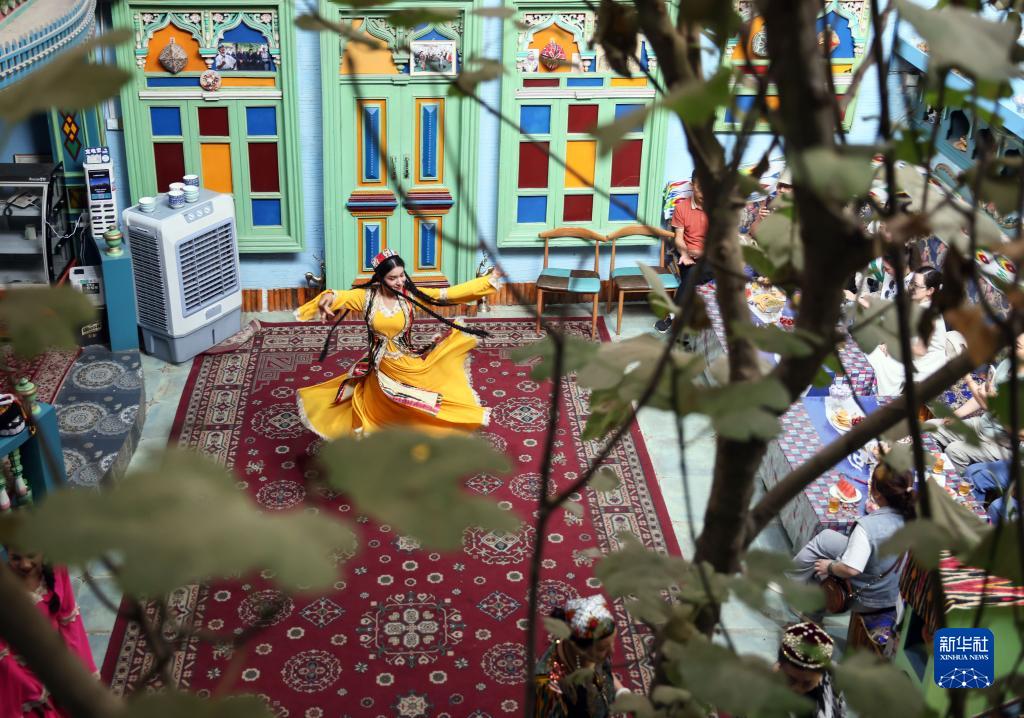 在新疆喀什古城景區“古麗的家”旅游家訪(fǎng)點(diǎn),演員在隨音樂(lè )起舞(9月7日攝)。