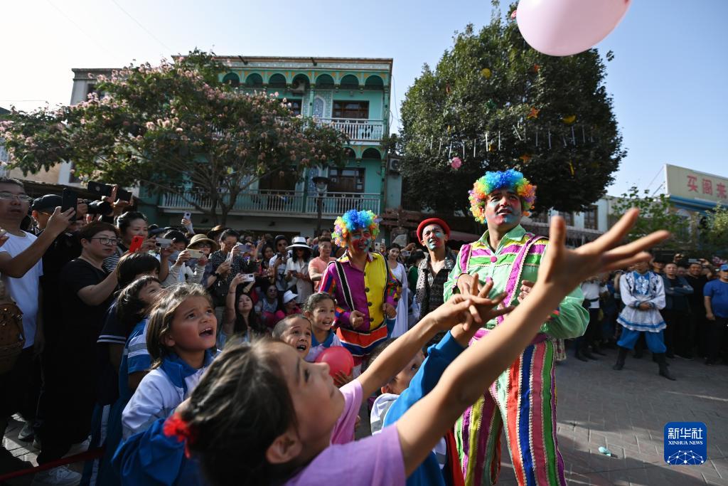 在新疆喀什古城景區內,演員與小朋友們互動(dòng)(9月7日攝)。
