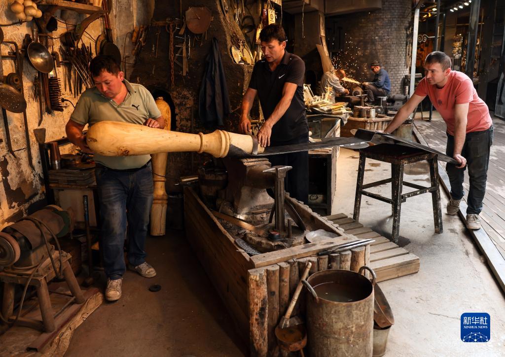 在新疆喀什古城景區鐵業(yè)公社內,手藝人在制作鐵器(9月6日攝)。