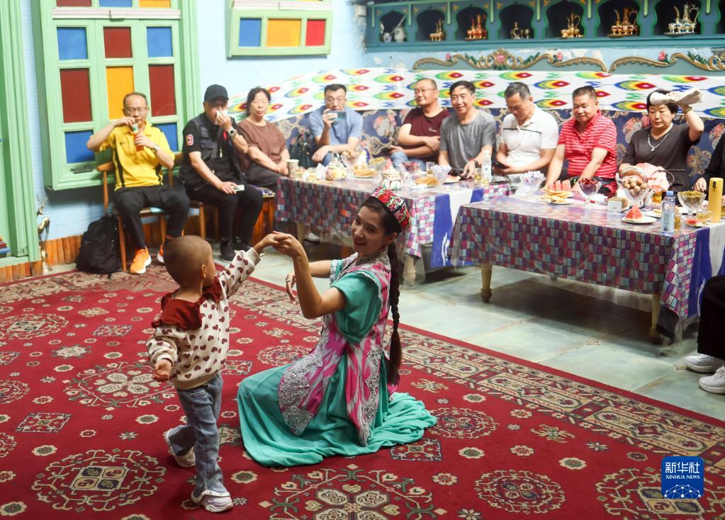 在新疆喀什古城景區“古麗的家”旅游家訪(fǎng)點(diǎn),當地居民在隨音樂(lè )起舞(9月7日攝)。