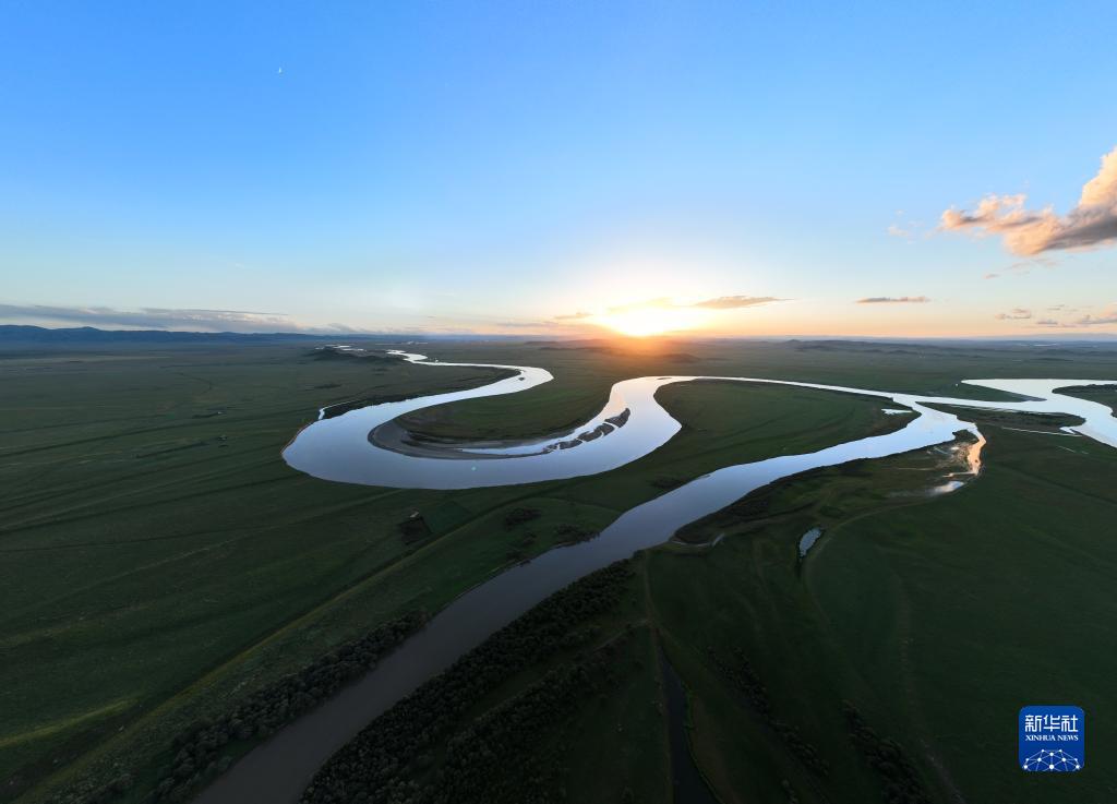這是8月21日在四川省阿壩藏族羌族自治州若爾蓋縣唐克鎮拍攝的黃河九曲第一灣落日(無(wú)人機照片)。