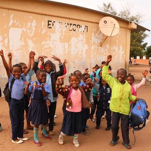 7月25日,莫桑比克馬普托省皮科科村學(xué)校的孩子們站在裝有中國援助的衛星電視接收天線(xiàn)的房屋前。