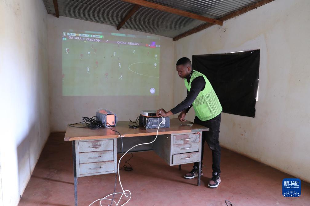 7月26日,在莫桑比克馬普托省戈巴村,瓜達吉亞查看中國援助的投影電視設備。