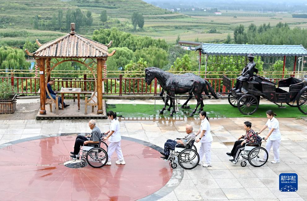 9月11日,在河北省灤州市王店子鎮海洋養老中心,醫務(wù)人員帶領(lǐng)老人們在庭院中散心。