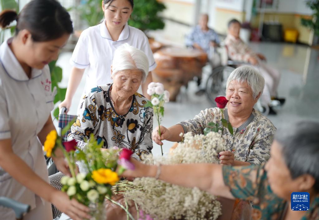 9月11日,在河北省灤州市王店子鎮海洋養老中心,醫務(wù)人員和老人們一起練習插花藝術(shù)。