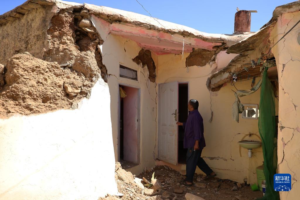 9月10日,在摩洛哥震中附近的艾米茲米茲村,一名男子查看損毀的自家房屋。