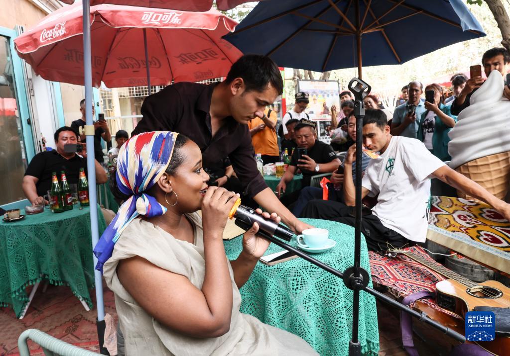 海迪雅在自家咖啡館前唱歌,丈夫迪力夏提為其端來(lái)一杯飲品(9月7日攝)。