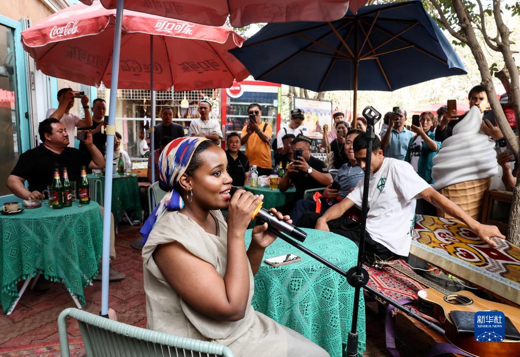 海迪雅在自家咖啡館前唱歌(9月7日攝)。
