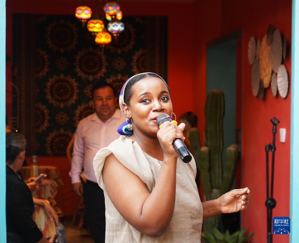 海迪雅在自家咖啡館前唱歌(9月7日攝)。