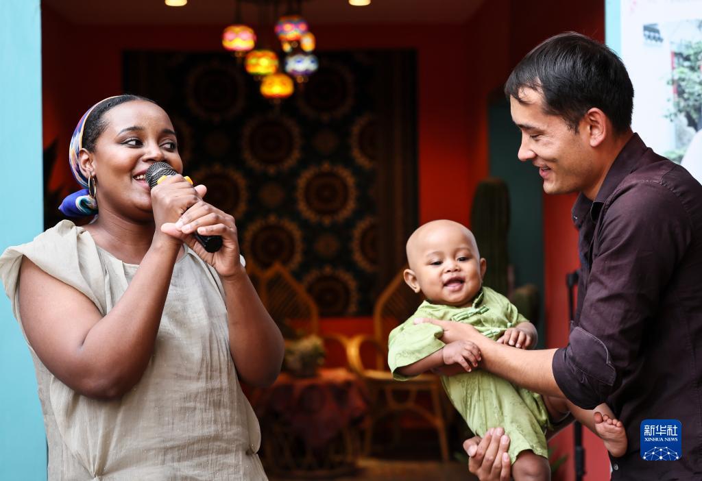 海迪雅在自家咖啡館前唱歌,丈夫迪力夏提抱著(zhù)孩子與她互動(dòng)(9月7日攝)。