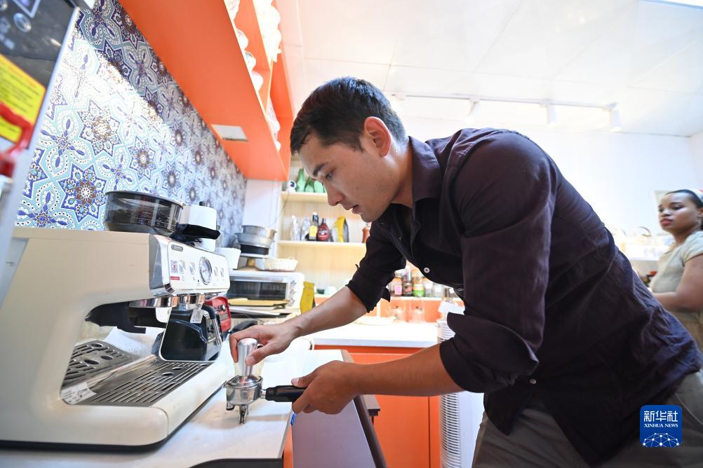 迪力夏提(左)和海迪雅在自家咖啡館內為顧客制作咖啡(9月7日攝)。